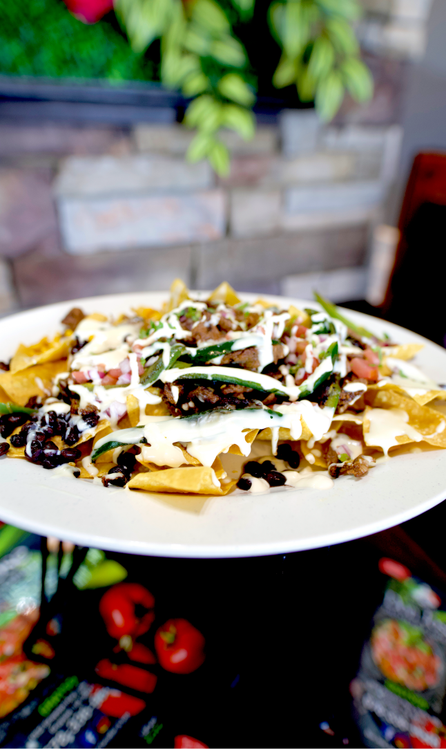 Steak, chicken or pork, jalapenos pepper, pico de gallo, corn, sour cream, black beans covered with cheese sauce.
